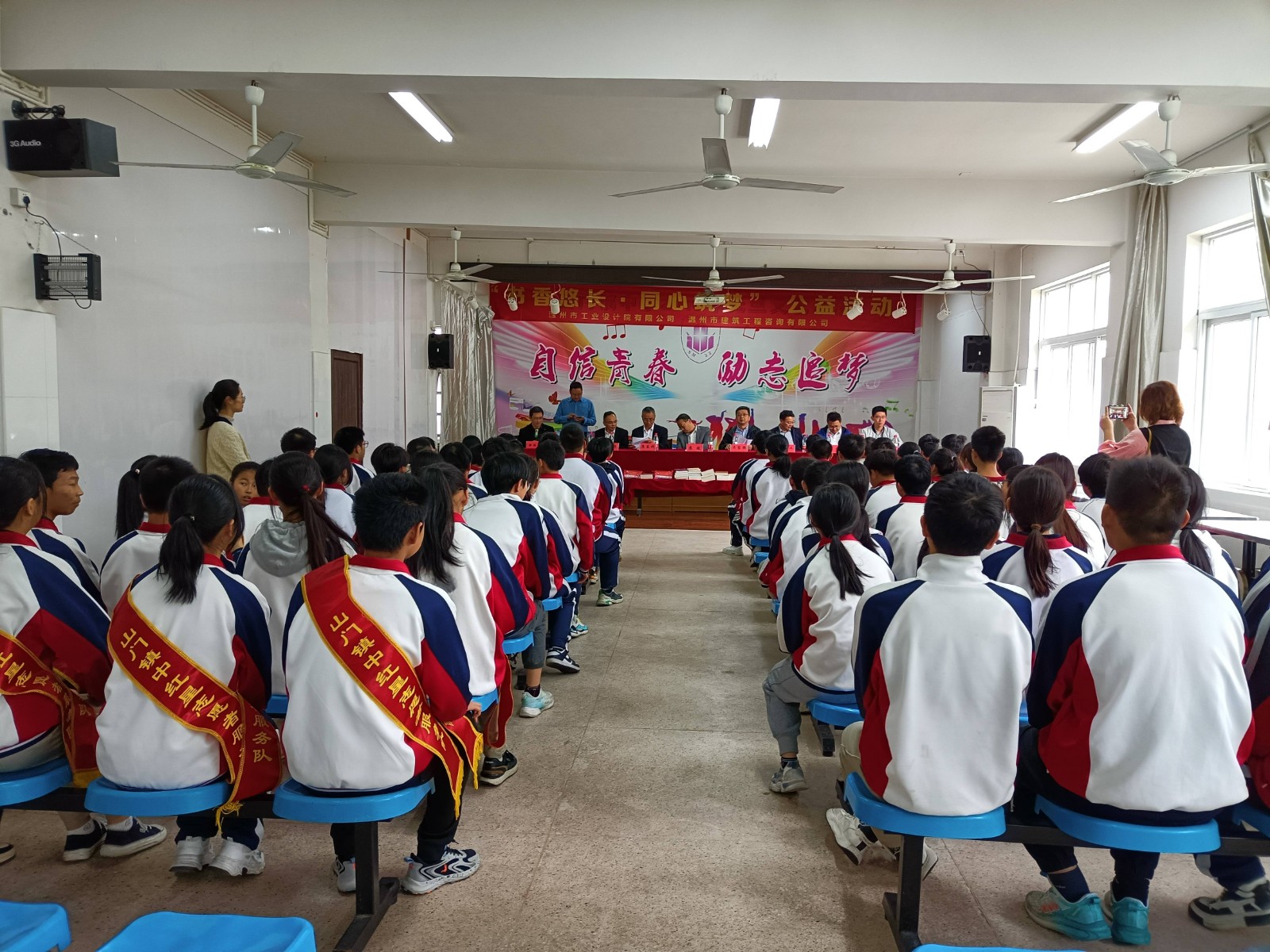 本次活動在雄偉莊嚴的國歌聲中拉開了帷幕,山門鎮(zhèn)黨委副書記、鎮(zhèn)長蘇斌,山門鎮(zhèn)初級中學(xué)書記、校長蘇連福首先對工業(yè)院、建設(shè)咨詢公司一行的到來表示歡迎,對兩支部關(guān)心老區(qū)教育,心系老區(qū)學(xué)子,熱心公益事業(yè)致以衷心的感謝。蘇斌表示,學(xué)校今后將大力開展閱讀活動,努力打造書香校園,希望學(xué)生們通過閱讀打開通往世界的大門。同時,他教導(dǎo)學(xué)生們要以感恩之心暢享閱讀、沐浴書香,以優(yōu)異的成績來報答社會的關(guān)愛之情。